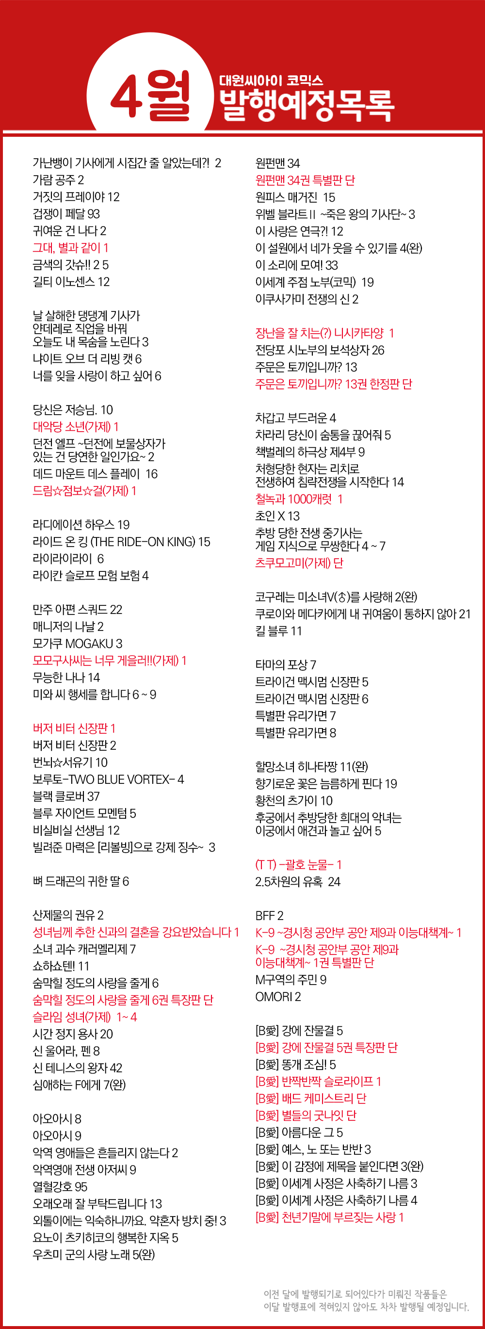 *붉은색으로 표기된 도서는 이달 첫 출간되는 1권 혹은 단권입니다.