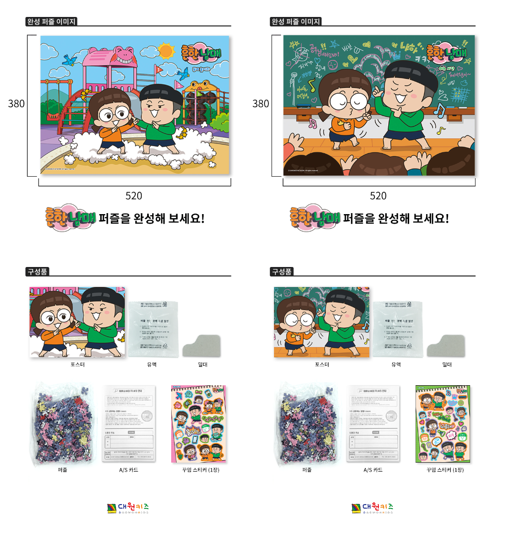 <흔한남매> 유튜브 영상 중에서 조회수가 높은 콘텐츠인 <동네 놀이터>와 <쉬는 시간>을 재미있는 일러스트로 그려 퍼즐로 만들었습니다. 마치 바로 옆에서 움직이는 듯한 이미지로 좋은 그림으로도 손색이 없습니다.